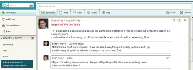 Shareflow is very similar to Wave in many respects (with one key omission, which we’ll cover below). You can start a “Flow,” which is a threaded series of comments, much like a Wave. You can invite other users to a Flow, and then those users can post new comments to the Flow, or reply to existing comments.