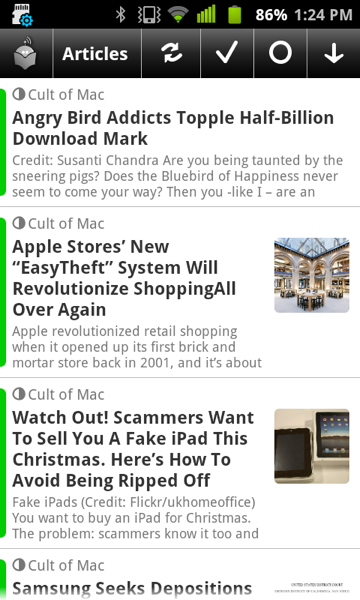 Your article list is configurable. You can choose whether to display snippets and a thumbnail, or just a list of stories. The app isn’t fancy, but if you have thumbnails enabled, it isn’t hard on the eyes, either. A green flag to the left of a feed or a category indicates whether that feed or category contains unread items.