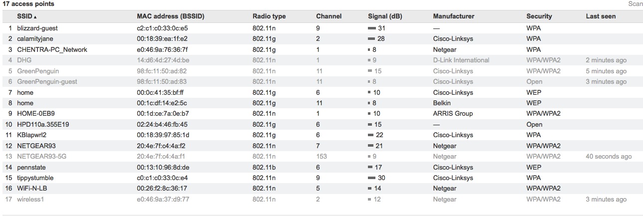 WiFi Stumbler is a web app, in the form of a java applet. It works by scanning for nearby networks, and then listing their MAC address, radio type (B, G, N, etc.), channel, signal strength, manufacturer, and security used. As signals drift out of range, they are grayed out in the list.