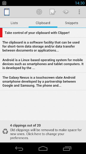 Clipper is billed as a clipboard manager for Android, and it does a good job of that. It resides in your notification bar and monitors your Android clipboard, allowing you to select from recently copied items, and insert them back into documents, email messages, and other text fields.