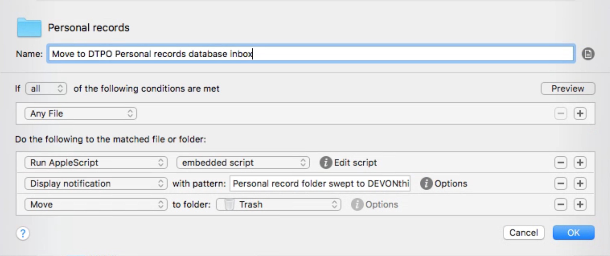 This particular Hazel rule takes files placed into the folder, and moves them into a database in DEVONthink called “@p:records,” and, more specifically, into the Inbox group in that database. Once the file has been moved, the rule sends me a notification and deletes the file from its original location on my Mac. To use this on your Mac, you’ll need to change the AppleScript to reflect the name of your database and the name of the group (such as the Inbox) where you want your file to end up. Please note that in my case, I’ve renamed my Inbox to “Inbox-records.” Yours will just be called “Inbox” if you haven’t changed it.