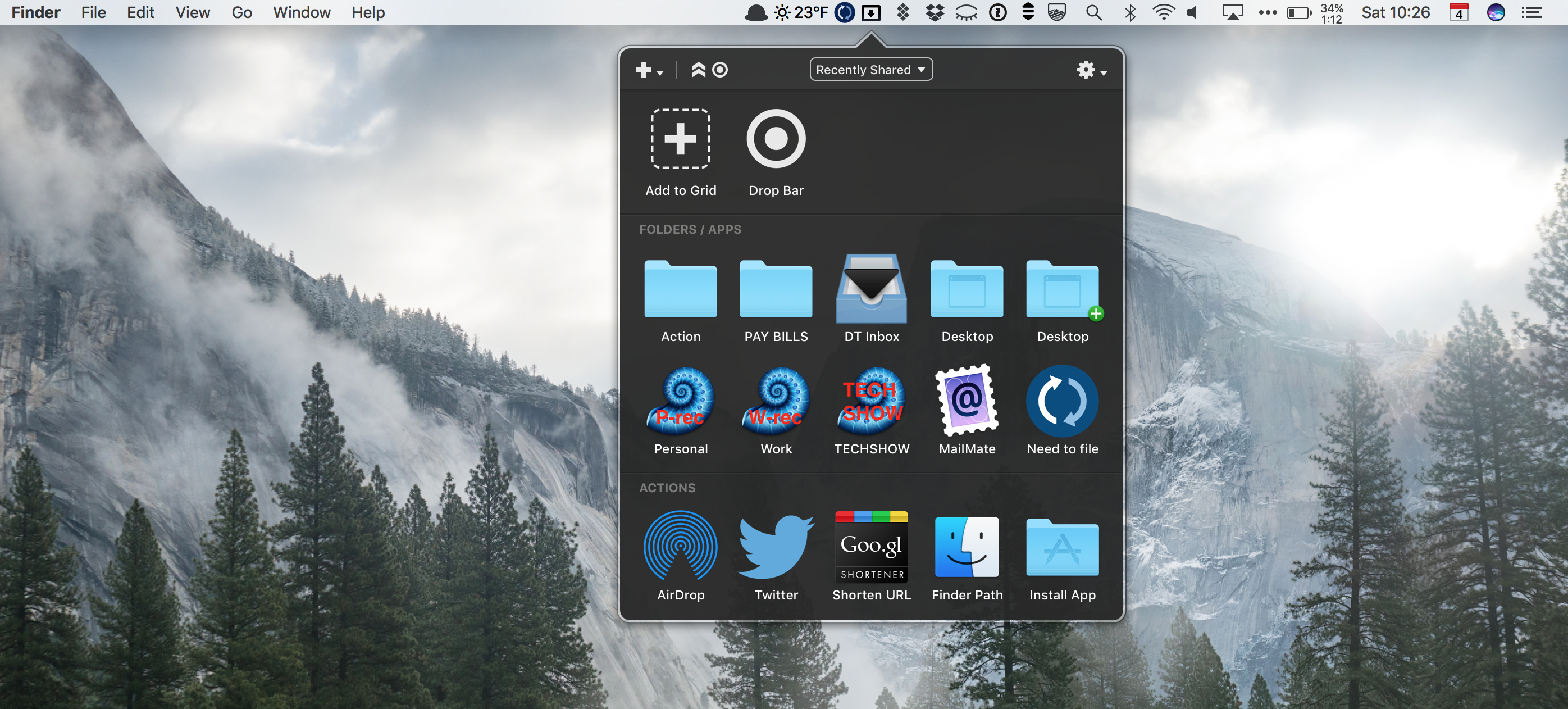 And because I don’t understand Dropzone’s concept of having the same folder in two places: within Dropzone (as a deletable pointer to the original folder) and outside it as an original folder, I use (the less sophisticated) Unclutter instead of Dropzone.