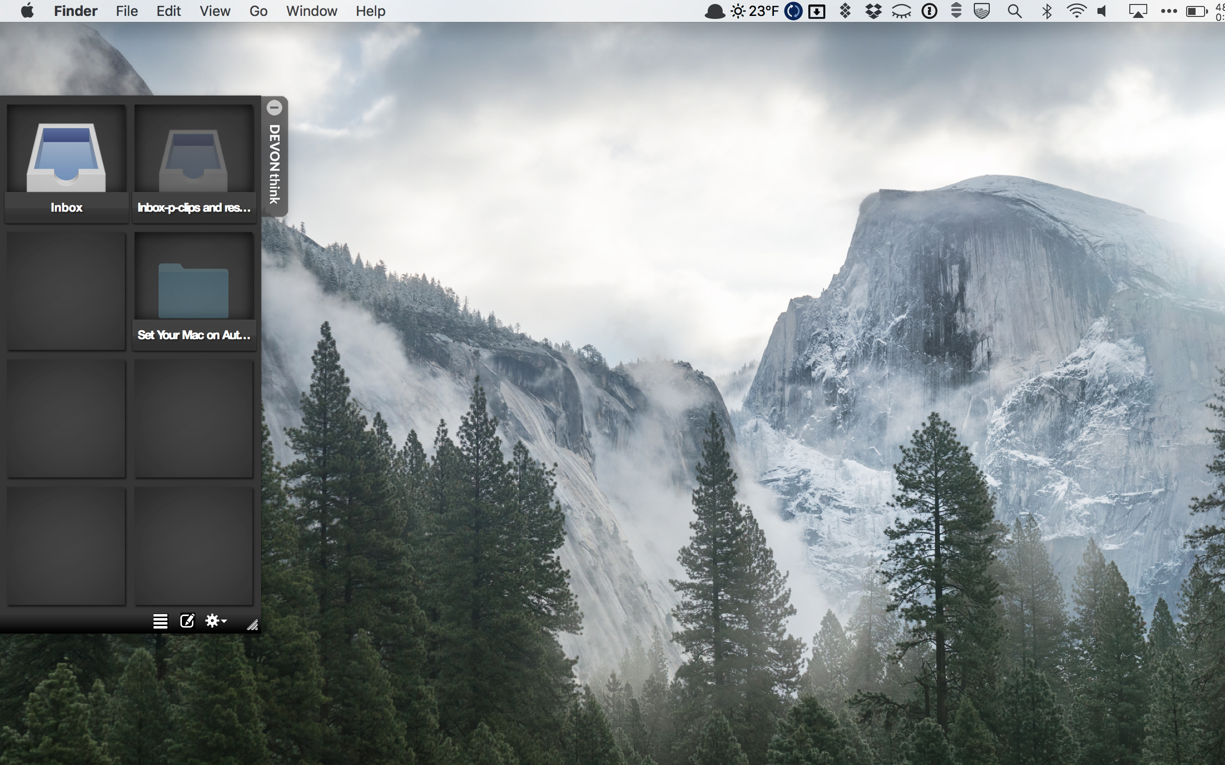 Once you have everything set up, you should be able to drag a file or email onto your menu bar, find your folder target in Dropzone, and drop your item onto it. The item will be moved into the proper location in DEVONthink.