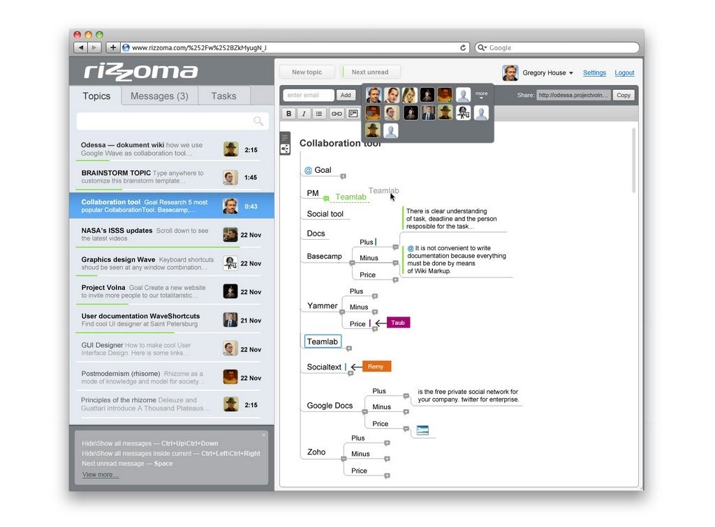 Rizzoma is a free, open source version of Google Wave that boasts some improvements to the look, feel, and function of the service. Some of the features they talk about on their site are an easy to use mobile version that actually works, improves search, the ability to to assign and track tasks within Rizzoma, easy team management and content sharing, and a built in mindmap mode.